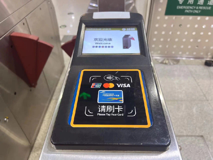 this photo shows you can use the visa, master and union pay cards directly when taking the beijing subway , just tap your card on this board
