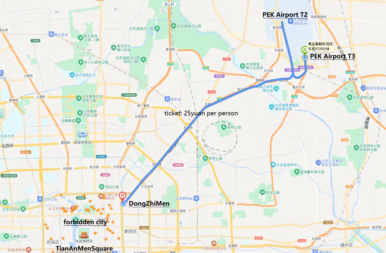 To TianAnMen Square of Forbidden City by Airport train and subway from PEK airport will take around 30yuan per person for one way, around 1.5 hours, start from airport t3, getting off at DongZhiMen to transfer Line 2 subway, getting off at JianGuoMen to transfer to Line 1 subway, getting off at the TianAnMen East.