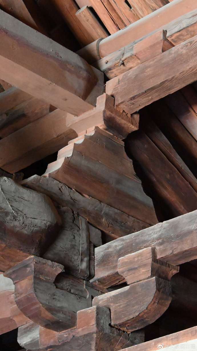 the complicated dougong brackets extend to the exterior to support the eaves as well as the roof, they sit on the large beams, supported by the tall columns, but the columns are not founded in the earth and are free-standing, all these structural parts bear the roof's immense weight.